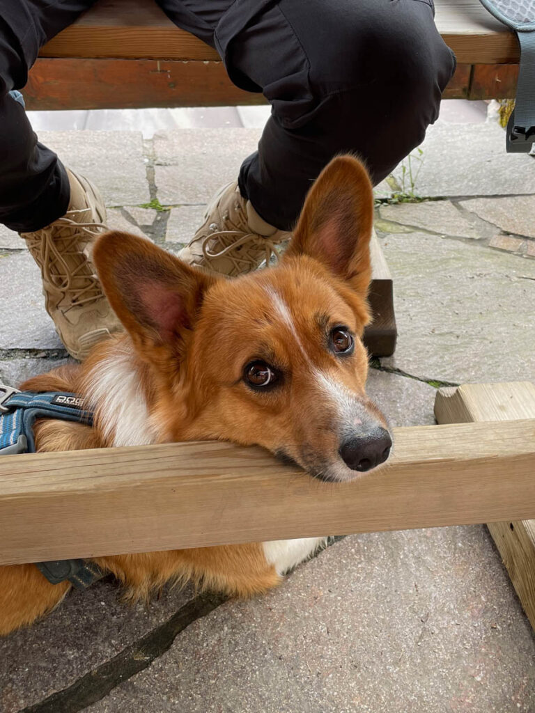 Na ca. 10km hebben we Bux in de rugzak gedaan. Daarmee trokken we uiteraard veel bekijks. Achteraf weten we nu dat Bux prima 20km kan hiken, mits we genoeg pauzes nemen. Maar het is fijn om de optie te hebben als hij wel echt moe is of er gevaarlijke stukken zijn waar we geen onvoorspelbare bewegingen bij kunnen gebruiken. We gebruiken de K9 Kolossus rugzak in maat L en daar past onze corgi van 15kg goed in. Hij lijkt er op de foto hieronder een beetje scheef in te zitten, maar dat kwam omdat we de ritsen aan de zijkant niet goed hadden dichtgedaan. Normaal zit die er mooi recht en stevig in.